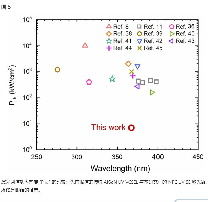 圖 5顯示了本研究中實現(xiàn)的激光閾值與先前報道的不同波長的傳統(tǒng) AlGaN UV VCSEL 的激光閾值的比較圖??梢钥闯?,對于傳統(tǒng)的AlGaN UV VCSEL,激射閾值在幾百kW/cm 2到MW/cm 2范圍內(nèi),并且激射閾值隨著激射波長的變短而增加,如虛線所示. 對于波長類似于本研究中波長的激光,閾值約為 0.7–1 MW/cm 2。相比之下,本研究中的激光閾值僅為 7 kW/cm 2左右。