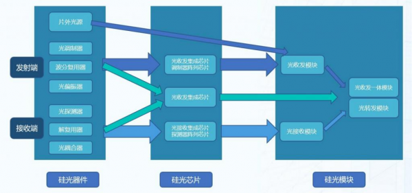 硅光芯片中的光器件可以分為有源器件和無源器件。有源器件包括激光器、調(diào)制器和光電探測器;無源器件包括平面波導(dǎo)、光柵或邊緣耦合器等。基于這些器件,可以構(gòu)成光發(fā)射 / 接收芯片,并開展陣列化的應(yīng)用,最終通過光子集成技術(shù)(PIC)來實(shí)現(xiàn)硅光芯片。硅光產(chǎn)業(yè)可分為三個(gè)層次:硅光器件、硅光芯片和硅光模塊。硅光器件包括光源、調(diào)制器、探測器、波導(dǎo)等,是實(shí)現(xiàn)各種功能的基本單元;硅光芯片是指將光發(fā)送集成芯片、光接收集成芯片、光收發(fā)集成芯片、相同功能器件陣列化集成芯片(探測器陣列芯片、調(diào)制器陣列芯片等)等若干基本器件進(jìn)行單片集成;硅光模塊是指進(jìn)一步將光源、硅光器件 / 芯片、外部驅(qū)動(dòng)電路等集成到一個(gè)模塊,包括光收發(fā)模塊、光接收模塊和光收發(fā)一體模塊等,是系統(tǒng)級(jí)的硅光產(chǎn)品形態(tài)。
