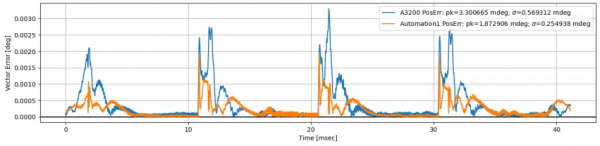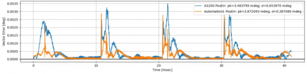 軌跡以機械角度(鏡面旋轉(zhuǎn))指定,而不是雷射束的光學(xué)角度。 如表1所示,Automation1 運動控制器生成軌跡點的速率是 A3200 控制器的兩倍多。這使得 Automation1-GL4 能夠?qū)⑵渌欧刂祁l率提高4.2%(從192kHz到200kHz),并將所需的內(nèi)插速率從1:4降低到1:2。