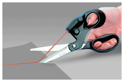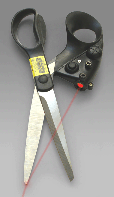 這把剪刀的刀把上嵌有一個激光發(fā)射器,如圖所示,發(fā)射出的激光投射在待剪物體表面,為使用者指明了剪刀前進(jìn)的方向。不曉得這算不算軍用激光制導(dǎo)技術(shù)在民用產(chǎn)品上的首例應(yīng)用。