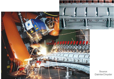 大眾汽車和奧迪的研發(fā)工程師研究了激光掃描焊接工藝的優(yōu)勢(shì)。同時(shí)奧迪成功解決了工裝夾具與零部件準(zhǔn)備等各種挑戰(zhàn),今天它們生產(chǎn)的部件質(zhì)量更加卓越。從2007年初,后續(xù)的奧迪 A4車門就已經(jīng)采用激光掃描焊接工藝與TRUMPF公司制造的4千瓦圓盤激光器。應(yīng)用此技術(shù)后,四個(gè)制造單元每天可生產(chǎn)1800扇車門。每個(gè)激光掃描系統(tǒng)均為TRUMPF公司生產(chǎn)的TruDisk 4002,它們采用了最新的圓盤激光器,4千瓦的功率輸出僅由兩個(gè)圓盤產(chǎn)生[7,8]。