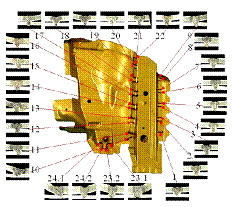 -2所示為BMW轎車的某個(gè)部件使用激光掃描焊接后提高生產(chǎn)率的例子,該工件需要焊接的部位達(dá)到20多個(gè),采用電阻焊接需要30 s,采用傳統(tǒng)激光焊接需要23 s,而采用激光掃描焊接,焊接時(shí)間縮短到5 s,而且焊縫檢測(cè)顯示各個(gè)部位的焊接質(zhì)量?jī)?yōu)良。