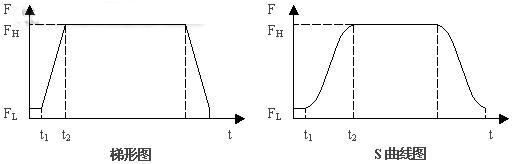 在高速往返運(yùn)動(dòng)和快速行推進(jìn)過程中,如果不加技術(shù)處理,如梯形圖所示,在加速度很大的高速運(yùn)動(dòng)過程中,就會(huì)出現(xiàn)振動(dòng)、沖擊,圖形就會(huì)出現(xiàn)不規(guī)則的錯(cuò)位,嚴(yán)重時(shí)就會(huì)出現(xiàn)類似波紋狀的變形。如果將加速度減小,則增速時(shí)間(t2-t1)就很大,由于加工區(qū)在高速段(FH勻速段),這樣就造成有效加工幅面減小。為了解決這個(gè)問題,在變速運(yùn)動(dòng)中采用S曲線,可以使運(yùn)動(dòng)在很短的時(shí)間里,由低速向高速或由高速向低速平緩地過渡。經(jīng)過現(xiàn)場(chǎng)反復(fù)的實(shí)驗(yàn),在同一設(shè)備上,可以大大的提高工作效率和圖形的加工質(zhì)量。