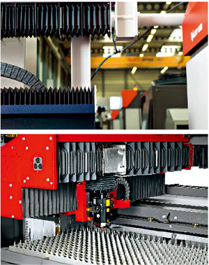 擴束和偏振作用之后,光束必須得到充分保護,以便在到達切割臺時保持其特征。百超的激光傳輸是在帶防護罩的光束通道中完成的。這個裝置非常復雜,它必須滿足質(zhì)量方面的許多需求:首先它不能是易燃的,必須是完全密封的,須有一定的使用壽命,不能透氣。密封,這就意味著它必須不透塵、不透水、不透氣。開發(fā)團隊更傾向于防護罩是真空的,因為這樣的話,光束就可以以最小的干擾傳輸。由于在技術(shù)上這樣做是行不通的,所以百超利用純凈空氣(即幾乎沒有濕度的空氣)保護光束通道,濕氣和塵垢一樣具有類似的負面作用,可改變光束的橫截面和光束特征,另外一個關(guān)鍵參數(shù)是CO2含量。為了防止上面所提及的類似雜質(zhì)進入周圍的空氣,防護罩要保持一定的壓力。