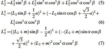 根據(jù)關(guān)節(jié)變量L1、L2和L3 ,以及B1、O、B3 點坐標(biāo),列距離方程可以求解到L2分支繞X 軸和繞Y軸的旋轉(zhuǎn)角度α和β .其求解方程如下: