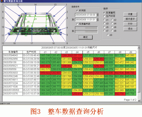 整車數(shù)據(jù)查詢是按整個(gè)車身進(jìn)行查詢,反映整個(gè)車身的情況。整車數(shù)據(jù)查詢既可以按照車身的生產(chǎn)時(shí)間進(jìn)行查詢,也可以按照車身的編號(hào)進(jìn)行查詢。查詢數(shù)據(jù)的列表可以采用多種排序方式:車身編號(hào)和點(diǎn)號(hào)、點(diǎn)號(hào)和車身編號(hào)、生產(chǎn)時(shí)間及生產(chǎn)班次等。數(shù)據(jù)的顯示采用3種不同的底色來反映測量點(diǎn)加工誤差的大小。
