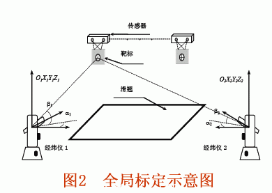標(biāo)定出從世界坐標(biāo)系到傳感器三維坐標(biāo)系的12個(gè)外部參數(shù);全局標(biāo)定采用的是中介坐標(biāo)系方案(圖2),通過采用靶標(biāo),求出測量傳感器所對應(yīng)的傳感器坐標(biāo)系到經(jīng)緯儀坐標(biāo)系的轉(zhuǎn)換矩陣,完成坐標(biāo)系的統(tǒng)一。