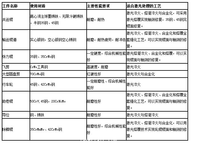 鋼鐵行業(yè)中的主要易損件還包括:夾送輥、輸送輥、張力輥、飛剪、大型圓盤鋸、行車輪、卷筒、助卷輥等。其主要材質(zhì)、性能和適合激光加工的工藝要求見表 。