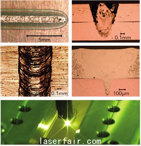 脈沖Nd:YAG激光焊接可被應(yīng)用于點(diǎn)焊銅至鋁的應(yīng)用(在邊焊設(shè)置下)。若要成功將鋁和銅在疊焊設(shè)置中焊接,可通過一臺(tái)單模式光纖激光器實(shí)現(xiàn)。因?yàn)椴牧蠈傩缘牟煌?,熔融區(qū)域在界面處變化顯著。只有激光束的核心部分穿透進(jìn)入了銅片。盡管如此,連接點(diǎn)在拉伸剪切強(qiáng)度和疲勞測試中顯示了出色的強(qiáng)度和耐久度。(作者:Hans J. Herfurth )