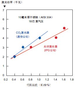 光纖激光器切割在切割薄型金屬的時(shí)候,相比CO2激光器有明顯的速度優(yōu)勢(shì),如圖1所示。從圖2和圖3中可以看出,在所標(biāo)明的切割速度下,光纖激光器切割比CO2激光器所需要的功率要低,說(shuō)明工件材料所吸收的光纖激光器光束更多,從而提高光纖激光器光束的融化速度。表1中呈現(xiàn)的是圖2和圖3光纖激光系統(tǒng)應(yīng)用中的規(guī)格。光纖激光器的速度優(yōu)勢(shì)在切割厚型金屬的時(shí)候并不明顯。對(duì)于較大的工件厚度(大于4毫米),光纖激光器切割速度下降到一個(gè)相當(dāng)于CO2激光器切割速度的水平。從本質(zhì)上講,光纖激光器切割大型厚工件的速度大幅下降,主要?dú)w因于光纖激光器輻射的吸收機(jī)制。金屬部件對(duì)光纖激光器輻射的吸收性在其厚度較小的時(shí)候達(dá)到最高值,隨之變厚時(shí)而下降;相反CO2激光器的輻射吸收性隨著加工金屬部件的厚度增加而增強(qiáng),在加工部件厚度達(dá)到最高的時(shí)候吸收性也隨之達(dá)到最高值。
