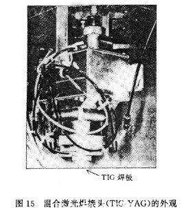 圖15示出同軸TIG-YAG激光焊接頭的外貌。這種焊接方法,是把從光纖射出的光束分開,將TIG焊極設(shè)置在其中央,使光束在TIG焊極頂端下方再次聚光,同軸向同一地方照射聚光光束和TIG弧光,進(jìn)行焊接。
