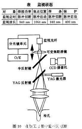 焊接狀況的圖像,同時(shí)分光、探測(cè)焊接部的發(fā)光。為了使熔深加深,采用脈沖振蕩。根據(jù)焊接狀況圖像,對(duì)熔池形狀和焊接坡口線位置進(jìn)行圖像處理,并向操作人員提供視覺信息。焊接部的發(fā)光抽出,與以前所實(shí)施的采用多條監(jiān)視光纖的方法對(duì)應(yīng),因?yàn)?/font>焊接頭所要求的空間制約條件并不嚴(yán)格,用一根監(jiān)視光纖把用半反射鏡分出的光抽出。下表中示出焊接部發(fā)光的抽出方法。這里采用的是在抽出焊接參數(shù)、激光器輸出、焦點(diǎn)位置變化的同時(shí),探測(cè)穿透焊接時(shí)內(nèi)部波穩(wěn)定性和焊接保護(hù)狀況。