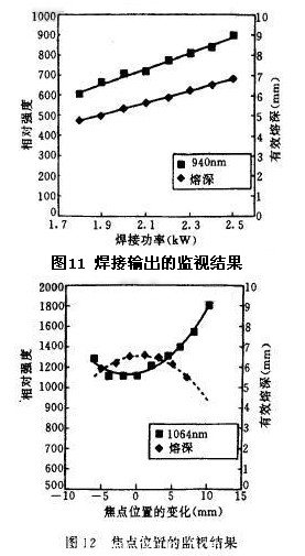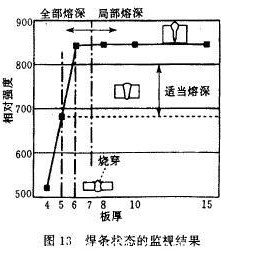 圖11示出焊接輸出的監(jiān)視結(jié)果與熔深深度的比較。從此結(jié)果中可以看出,熔深深度變化0.4mm時(shí),就可探測(cè)到輸出功率100W左右的焊接變化。圖12示出焦點(diǎn)位置和YAG激光器反射光及熔深深度的關(guān)系。這里雖然采用焦點(diǎn)深度Bf=200mm的大透鏡,但是可以探測(cè)士4mm的熔深變化。圖13示出穿透和未穿透時(shí)的發(fā)光強(qiáng)度變化。穿透焊接時(shí),因?yàn)槿廴诮饘僭诎鍍?nèi)穿過,所以發(fā)光強(qiáng)度下降,于是就能探測(cè)到可以獲得穩(wěn)定的內(nèi)部波焊道的狀態(tài)。