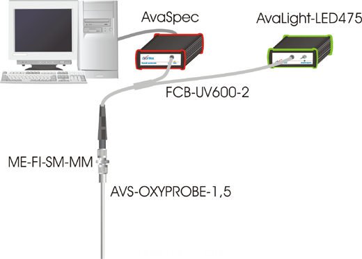 AvaSoft-OXY應用軟件即可以用來校準傳感器,又可以監(jiān)測氧含量。下圖為氧含量測量的典型裝置。