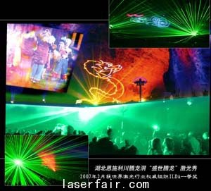 激光藝術(shù)、表演藝術(shù)、虛擬藝術(shù)融合,清新、絢麗的動(dòng)感畫(huà)面,神奇、夢(mèng)幻的故事情節(jié),壯觀、奇特的視覺(jué)盛宴,美輪美奐。集聲、光、電、影、水、火、幕等于一體的特殊藝術(shù)表演模式。其表現(xiàn)手法是基于最超前科技--彩色激光為載體,融入絢爛奪目光影效果,配合創(chuàng)意構(gòu)思動(dòng)漫酷圖以及個(gè)性立體畫(huà)面,及曲折的故事,從多元化空間撲朔迷離的表現(xiàn)出夢(mèng)幻的激光影像