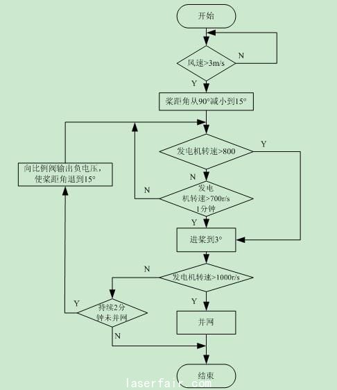 風(fēng)力機(jī)起動(dòng)時(shí)變槳控制程序流程如圖7所示。當(dāng)風(fēng)速高于起動(dòng)風(fēng)速時(shí)PLC通過(guò)模擬輸出單元輸出1.8V電壓,使葉片以0.9°/s的速度變化到15°。此時(shí),若發(fā)電機(jī)的轉(zhuǎn)速大于800r/s或者轉(zhuǎn)速持續(xù)一分鐘大于700r/s,則槳葉繼續(xù)進(jìn)槳到3°位置。PLC檢測(cè)到高速計(jì)數(shù)單元的轉(zhuǎn)速信號(hào)大于1000r/s時(shí)發(fā)出并網(wǎng)指令。若槳距角在到達(dá)3°后2分鐘未并網(wǎng)則由模擬輸出單元給比例閥輸出-4.1V電壓,使槳距角退到15°位置。