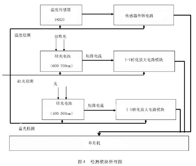 檢測模塊利用光照傳感器、溫度傳感器實時檢測設施內(nèi)部光照強度和溫度,并將采集數(shù)據(jù)提供給單片機進行處理,原理圖如圖4 所示。其中,溫度檢測模塊由溫度傳感器18B20 及其標準調(diào)理電路組成,數(shù)據(jù)線接入單片機P1. 0 口,實現(xiàn)對溫度的采集。光照檢測包括紅光光強檢測和藍光光強檢測,采用波長范圍在400 ~ 500nm 的藍光2BU6 硅光電池和波長范圍600 ~ 700nm 的紅光2BU6 硅光電池作為檢測元件。采用4 路運算放大器LM324 設計運算放大器將硅光電池的微弱模擬信號分別進行轉換和放大,最終將模擬信號接入單片機P1. 1,P1. 2 端口進行A/D 轉換,從而實現(xiàn)分波段光強檢測。
