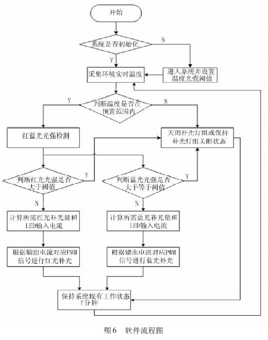 該系統(tǒng)軟件主要包括傳感器解析函數(shù)、數(shù)據(jù)管理與參數(shù)設定程序、PWM 信號控制程序和顯示程序,實現(xiàn)3 類參數(shù)設置、環(huán)境因子采集以及對受控燈組的自動控制功能,軟件流程如圖6 所示。系統(tǒng)工作時,首先需要對溫度,紅藍光強閾值進行設置,溫度傳感器周期對設施內(nèi)溫度監(jiān)測,判斷溫度是否超出不利于光合作用的閾值范圍,超出則關斷LED 補光燈組。當溫度在所設閾值范圍內(nèi),再分別對紅、藍光進行光強檢測,實際光強在閾值之內(nèi)時,系統(tǒng)進入自動定量補光狀態(tài),根據(jù)所設閾值與實際值之差計算實際需光量,進而再根據(jù)與實際需光量對應的兩路PWM 控制信號的占空比,分別產(chǎn)生對應的PWM 信號,達到控制LED 燈的亮度對植物實施精確補光的目的。