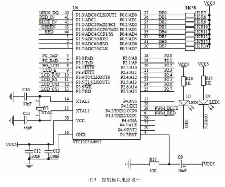 控制模塊選用STC12C5A60S2 單片機作為核心處理器,采用5V 電源供電,具有8 路10 位A/D 接口、2 路PWM 輸出口、Flash 存儲空間56K、靜態(tài)存取內(nèi)存1 280B、可編程只讀存儲器1K,完成節(jié)點任務調(diào)度、數(shù)據(jù)采集、智能管理、控制信號輸出、閾值的調(diào)整、數(shù)據(jù)轉儲等工作,電路如圖3 所示。其中,P0 口連接液晶屏的8 路數(shù)據(jù)口; P1 口負責與采樣信號連接,P1. 0 接入溫度檢測信號、P1. 1 接入紅光檢測信號、P1. 2 接入藍光檢測信號,從而完成對傳感器監(jiān)測數(shù)據(jù)的采集;P2 口連接4 × 4 矩陣鍵盤,P3. 0,P3. 1 用于單片機與串口連接的數(shù)據(jù)讀寫線,完成程序的下載; P3. 2 ~ P3.7 位液晶控制端; P4. 2,P4. 3 為單片機PWM 控制端輸出口,其根據(jù)單片機計算出與兩波段所需補光量對應的PWM 信號占空比,輸出PWM 信號對LED 燈組的亮度進行控制。