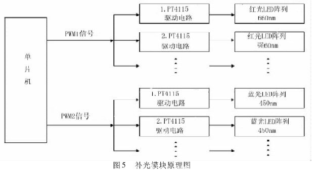 補光模塊包括LED 燈組及其驅(qū)動電路,驅(qū)動電路采用PT4115 驅(qū)動模塊電路,紅光和藍光兩個模塊獨立工作,原理圖如圖5 所示。其中,LED 燈組采用額定功率1W、中心波長為660nm 的窄帶紅光LED 陣列和中心波長為450nm 的窄帶藍光LED 陣列。由單片機輸出的兩路PWM 信號分別與紅藍光兩路PT4115的DIM 控制端相連,其中紅光驅(qū)動芯片與P4. 2 產(chǎn)生的PWM 信號接通,藍光則與P4. 3 產(chǎn)生的PWM 信號接通。利用PWM 的信號控制驅(qū)動芯片PT4115 的輸出電流,由此實現(xiàn)LED 燈組的定量補光。#p#分頁標題#e#