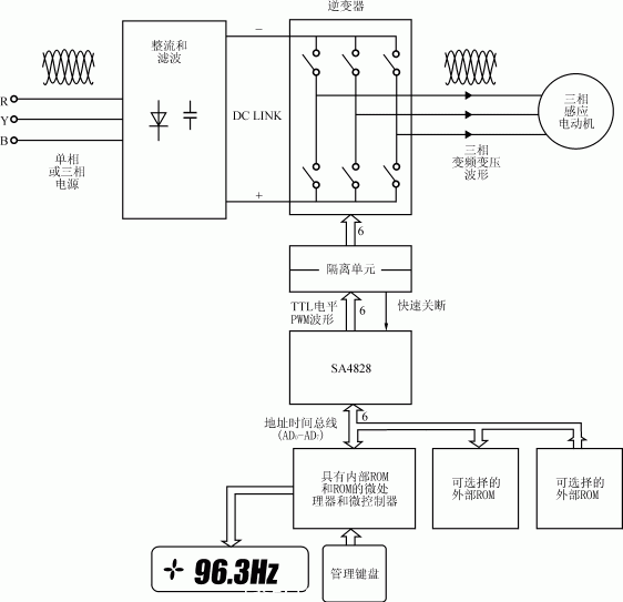 SA4828采用全數(shù)字化操作,載波頻率可達(dá)24kHz。內(nèi)部ROM中存有三種可選的輸出電源波形,諧波抑制技術(shù)可減少功率器件的損耗。16位頻率控制精度,三個獨(dú)立的幅值寄存器可進(jìn)行三相不平衡補(bǔ)償。利用SA4828設(shè)計(jì)的變頻器硬件結(jié)構(gòu)圖如圖1所示。