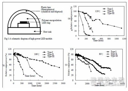 圖1高功率LED的模型結(jié)構(gòu)圖以及在工作環(huán)境溫度分別為(a)120℃、(b)100℃和(c)80℃下輻射功率和加速時(shí)間的關(guān)系圖