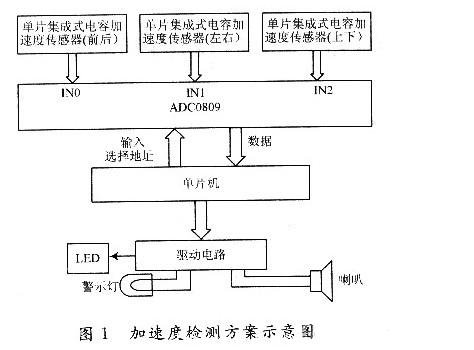 設(shè)計(jì)方案如圖1所示:包括傳感器及外圍電路、信號(hào)處理裝置、顯示報(bào)警電路等3部分。傳感器及外圍電路封裝于小型屏蔽容器內(nèi),固定于導(dǎo)彈載行車上,ADXL50加速度傳感器采集振動(dòng)加速度信號(hào),并輸出相應(yīng)的電壓信號(hào);信號(hào)處理部分接收到傳感器采集來(lái)的模擬電壓信號(hào),對(duì)其進(jìn)行模/數(shù)轉(zhuǎn)換,將加速度的值顯示于LED上,然后進(jìn)行數(shù)據(jù)判斷與處理,當(dāng)超過(guò)安全范圍時(shí)給出報(bào)警,提醒司機(jī)注意駕駛。