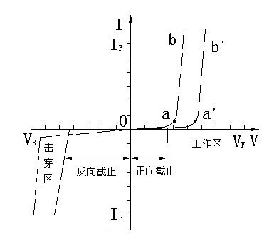 (1)正向死區(qū):(圖oa或oa′段)a點對于V0為開啟電壓,當V<Va,外加電場尚克服不少因載流子擴散而形成勢壘電場,此時R很大;開啟電壓對于不同LED其值不同,GaAs為1V,紅色GaAsP為1.2V,GaP為1.8V,GaN為2.5V。