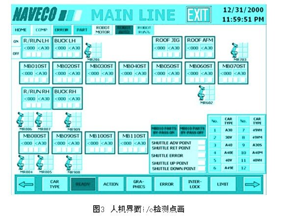 ?。?)自動控制:在自動方式下,由操作者啟動設(shè)備的自動控制程序,由系統(tǒng)自動控制設(shè)備的運行。將主控制柜與各工位上的“自動/手動”轉(zhuǎn)換開關(guān)均置于“自動”位置后按住“自動啟動”按鈕約三秒鐘,系統(tǒng)進入自動狀態(tài),此時若將某工位操作臺上的“自動/手動”轉(zhuǎn)換開關(guān)置于“手動”位置,系統(tǒng)即停止自動運行。在自動控制方式下1001、1002工位上件后可通過工位旁的按鈕操作相應(yīng)夾具動作,其余工位地板夾具當車體放好后夾具自動夾緊。每個焊接完成后分別按鈕該工位兩側(cè)的兩個完成按鈕后夾具會自動打開,頂升氣缸自動將車體升起,待所有工位工作完成車體全部頂起后輸送機構(gòu)自動前進將車體整體向前移動一個工位。