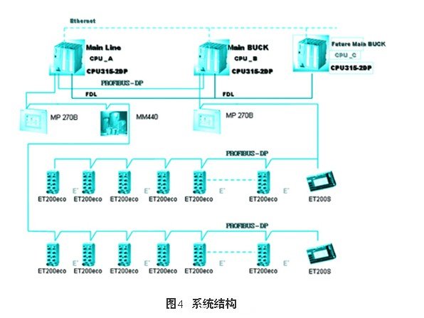 經(jīng)過縝密思考,最終我們選用了西門子s7-300plc,考慮到系統(tǒng)的擴展以及與其它廠家西門子系統(tǒng)的互聯(lián),系統(tǒng)的通訊都采用了profibus,互連采用工業(yè)以太網(wǎng),cpu選用的是315-2dp,通訊模塊用的是cp343-1 lean和cp342-5。系統(tǒng)的硬件配置及系統(tǒng)結(jié)構(gòu)如圖4所示。
