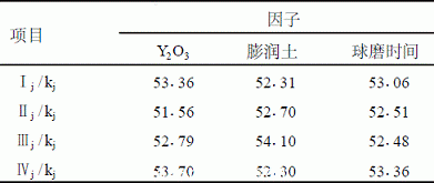 從圖2可以看出:隨著氧化釔含量的增加,指標(biāo)先降低后升高;而對膨潤土來說,隨著其含量的增加,指標(biāo)先升高后降低;對于球磨時間對指標(biāo)的影響規(guī)律,在0.45水平上才具有顯著性,所以已不具備可信度。