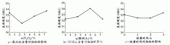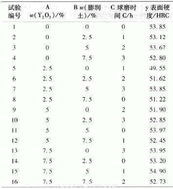 由各方差比可知:氧化釔含量對指標(biāo)表面硬度的影響在0.05水平上顯著;膨潤土含量對指標(biāo)的影響在在0.1水平上顯著;而球磨時間對指標(biāo)的影響在0.45水平上才顯著,說明此列可信度較低。