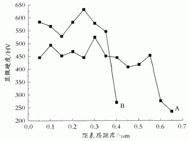 對于試樣A,由于功率較高,冷卻速度較功率低的慢,所以,A的最高硬度較B低。但其硬化層已達0.55mm厚,對于油管的長期綜合耐磨性能是有利的。綜上所述,本試驗確定的涂料達到了市售其他涂料的吸光效果,且能滿足工業(yè)激光加工的要求。