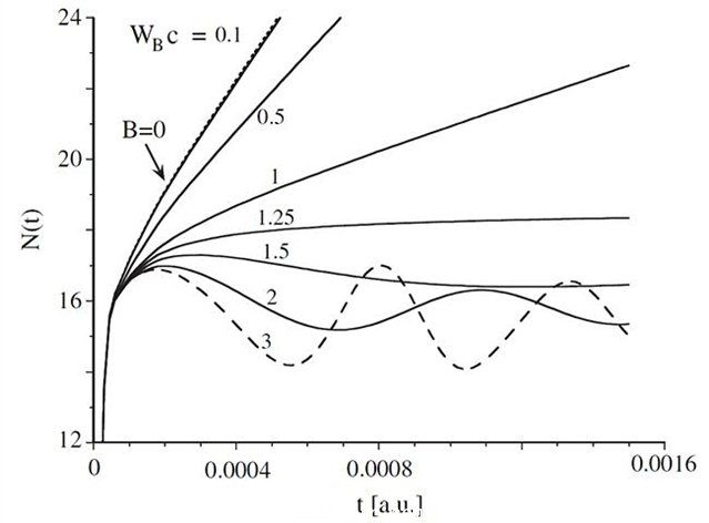圖1. 不同磁場寬度下正負電子對的產(chǎn)生數(shù)隨時間的變化關(guān)系。其中WB=1.25/c約為電子在磁場中的回旋半徑:磁場寬度小于回旋半徑時,粒子數(shù)持續(xù)產(chǎn)生,系統(tǒng)為超臨界;磁場寬度大于回旋半徑時,系統(tǒng)變?yōu)榇闻R界。