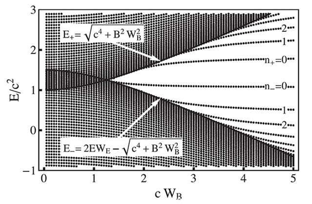 圖2. 根據(jù)總哈密頓量得到的能級分布隨磁場寬度WB變化關(guān)系。寬度小于回旋半徑時,正負能態(tài)交疊,能夠持續(xù)產(chǎn)生電子對;寬度大于回旋半徑時,正負能態(tài)分離并出現(xiàn)離散的朗道能級。