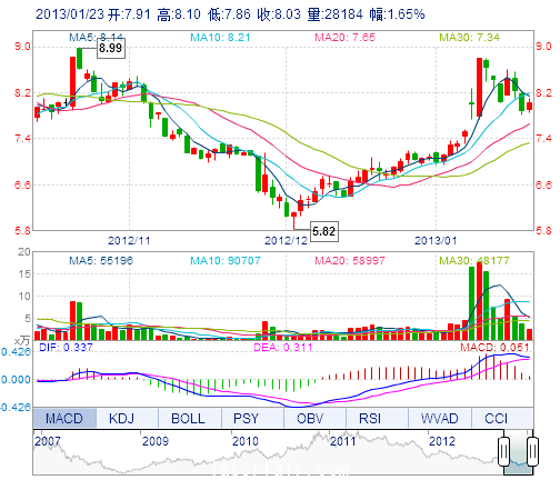 今 開: 7.91 成交量: 2.82萬(wàn)手 振 幅: 3.04% 最 高: 8.10 成交額: 2247.48萬(wàn)元 換手率: 1.45% 最 低: 7.86 總市值: 16.00億 市凈率: 3.22 昨 收: 7.90 流通市...