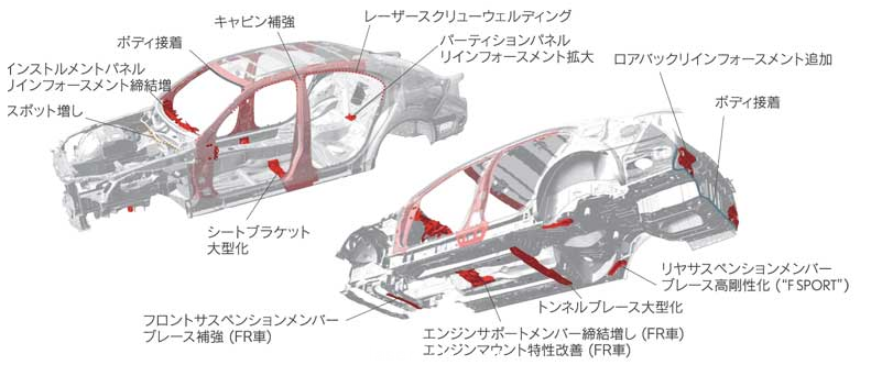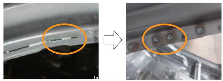另一方面,新開發(fā)的激光焊接方法則是在點焊的焊點之間形成多個圓形的焊接部。外表看來,會形成與點焊相同的直徑在5毫米左右的圓形焊接點。豐田并未公布使焊接點形成圓形的具體方法,不過根據(jù)名稱想像的話,估計是通過螺旋狀的照射激光形成的。LS通過在點焊的焊點之間形成多個這種圓形焊接點,與形成連續(xù)的線幅1毫米左右焊縫的激光焊接相比,增加了接合面積。由于接合面積增加,因此可抑制車門開口部的變形,車身剛性的提高得以實現(xiàn)。