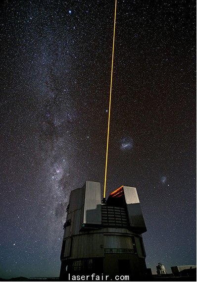 這是位于智利境內(nèi)歐洲南方天文臺的甚大望遠鏡(VLT),此時它正在對新近安裝到位用于導星的新型激光系統(tǒng)進行測試。