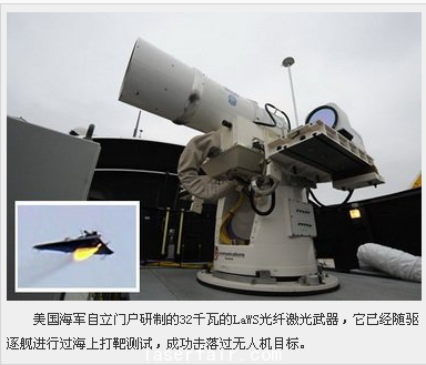 美國海軍還自行發(fā)展了激光近距離武器系統(tǒng)(LaWS),項目承包商為雷錫恩公司,目標是將該激光武器系統(tǒng)安裝在密集陣武器系統(tǒng)側面,激光器可對付15千米外的目標,保留的20毫米加特林速射炮負責1.5千米距離上的目標。LaWS采用了6IPG公司生產(chǎn)的5千瓦級光纖激光器,實現(xiàn)總輸出功率32千瓦。值得一提的是,LaWS為了降低系統(tǒng)復雜程度,并未采用光束相干合成技術,而是選擇將6條光纖緊密排列。LaWS系統(tǒng)在20128月進行首次海上打靶試驗,成功擊落無人靶機。LaWS項目的目標是獲得100千瓦輸出功率,按照美國商用光纖激光器目前發(fā)展的速度,該目標在2016年實現(xiàn)并不是遙不可及的目標。
