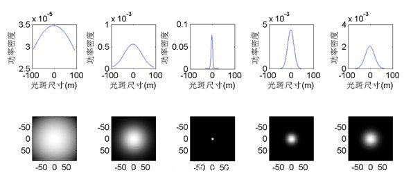 比如,我們假定透鏡焦距為1000 mm,下圖為當(dāng)激光束腰離單透鏡距離分別為200mm,500mm,1000mm,1500mm,2000mm的時(shí)候,在40km處激光光斑的一維和二維功率密度。由圖中可以看出,只有在激光束腰在單透鏡焦點(diǎn)附近(即1000mm)時(shí),才能很好的準(zhǔn)直,而當(dāng)激光束腰偏離單透鏡焦點(diǎn)位置時(shí),準(zhǔn)直效果很差。