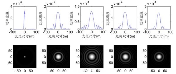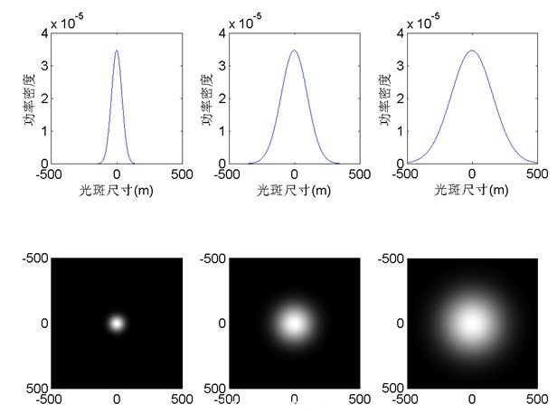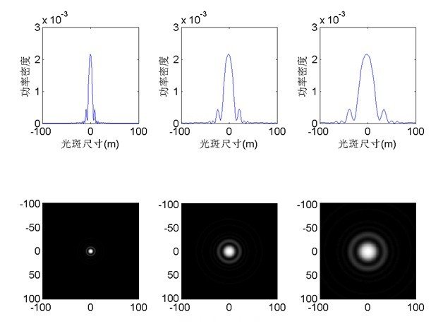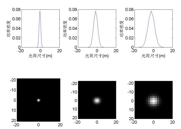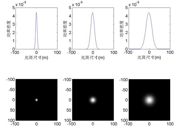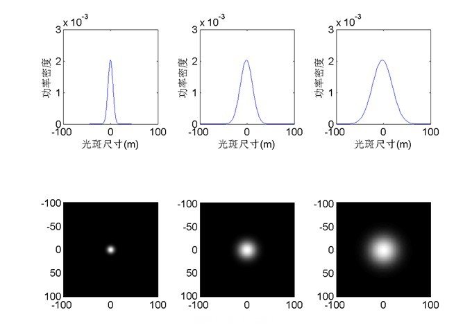 下圖為當(dāng)激光束腰在衍射元件前1000mm處,距離分別為10km,25km,40km時(shí)激光光斑的一維和二維功率密度。