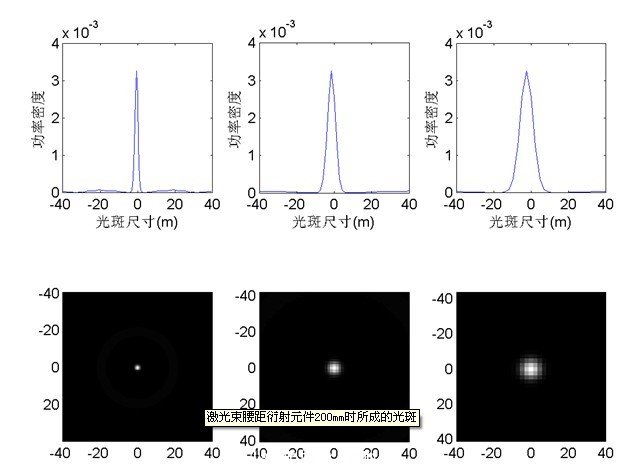 對(duì)應(yīng)的是f=1000的單透鏡當(dāng)激光束腰離透鏡為200mm時(shí)的時(shí)候在10km,25km,40km處激光光斑的一維和二維功率密度。可見(jiàn)其光斑半徑顯得很大。并不能很好的準(zhǔn)直。