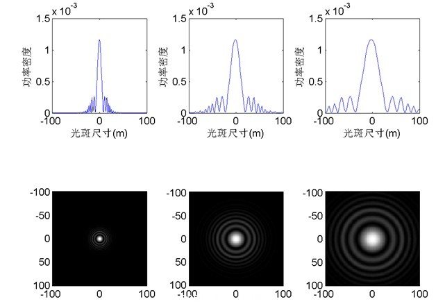 對(duì)應(yīng)的是f=1000的單透鏡當(dāng)激光束腰離透鏡為2000mm時(shí)在10km,25km,40km時(shí)激光光斑的一維和二維功率密度。