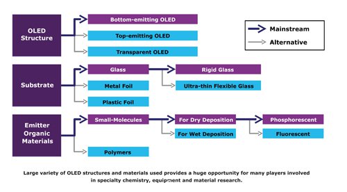 由于OLED未來展望是這樣的狀況,包括設(shè)備制造商、熒光及磷光發(fā)光材料供貨商、聚合物材料開發(fā)商,以及軟性基板的玻璃、塑料或金屬箔片制造商均已大舉投入發(fā)展,甚至有幾家企業(yè)正積極開發(fā)新的OLED結(jié)構(gòu)、封裝、滲入阻隔及新款電極的塑料或特殊技術(shù)方案。有如此眾多的企業(yè)涉及OLED照明領(lǐng)域可能頗令人意外,但這與有多少廠商涉入整個價值鏈有關(guān),而不只是有多少廠商在制造OLED面板。