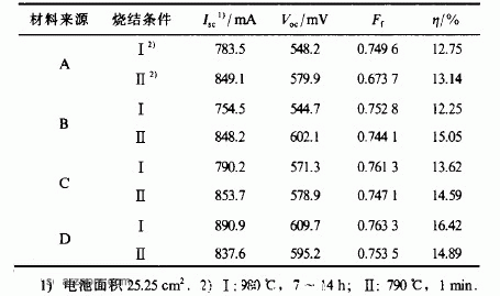 可以看到,經(jīng)高溫,長時間燒結(jié)的電池比經(jīng)低溫短時間燒結(jié)的電池其填充因子Ff都有明顯提高。說明這一燒結(jié)過程對改善歐姆接觸有良好的作用。然而,對采用A,B,C3種來源硅材料的電池來說,這以過程明顯降低了短路電流,開羅電壓而且抵消了Ff的增益,使轉(zhuǎn)換效率明顯下降。而對D材料則完全不同,長時間的高溫?zé)Y(jié)使3 個指標(biāo)都有所改善,明顯提高了轉(zhuǎn)換效率。