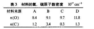 從表中可看出,D材料與前3種材料的碳,氧含量無大的差別。因而,導(dǎo)致前述差異的原因可以排除氧,碳雜質(zhì)含量的不同??赡艿脑蚴茿,B,C3種材料中金屬雜質(zhì)含量較多,高溫過程促進(jìn)了金屬雜質(zhì)與氧、碳沉淀的結(jié)合,使原本"潔凈"的沉淀成為有效的復(fù)合中 心,從而使高溫吸雜達(dá)不到其應(yīng)有的目的.另外,這一差異也可能是材料中不同生長缺陷在高溫過程中發(fā)生不同演化造成的.