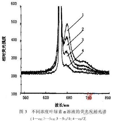 式(1)中:k為儀器常數(shù);Q為物質(zhì)熒光效率;I0為激勵(lì)光光強(qiáng);c為物質(zhì)濃度;b為樣品光程差;ε為摩爾吸收系數(shù)。當(dāng)所測(cè)量的熒光物質(zhì)確定后,k,Q,I0,b,ε均為常數(shù),則c與F成一定數(shù)學(xué)關(guān)系。對(duì)上式進(jìn)行分析可知,當(dāng)溶液很稀時(shí),εcb很小,則上式指數(shù)部分近似為1-εcb,相應(yīng)的F=kQI0εbc=ωc(其中ω=kQI0εb,在激勵(lì)光光強(qiáng)穩(wěn)定時(shí)是常數(shù)),即此時(shí)葉綠素α濃度與相對(duì)熒光光強(qiáng)近似成線性關(guān)系。因此在同一穩(wěn)定的激發(fā)光激勵(lì)下,可以根據(jù)葉綠素α的熒光發(fā)射光譜方便直觀地判斷葉綠素α的濃度。