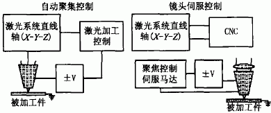 (5) 激光頭可自由運動,目前激光頭已達5個運動軸,即使工件在加工時保持固定,仍可實現(xiàn)復雜工件的加工,而且只要利用移動旋轉(zhuǎn)工作臺,就可加工比軸行程大的零部件。激光束采用自動聚焦控制。激光系統(tǒng)直線軸可沿光軸或任意軸定位,以保持光束聚焦;焦點位置任何時刻都精確可知,而且行程無限制。圖1示出了自動聚焦控制與鏡頭伺服控制的比較,由圖看見,鏡頭伺服系統(tǒng)中聚焦透鏡與激光系統(tǒng)移動無關(guān),因此焦點位置無法確定。