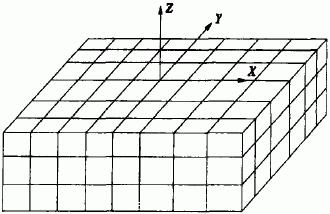 運動學模型的選擇是決定機器人絕對精度的重要因素之一。它必須正確地對影響機器人末端位姿的各種因素建模。增加運動學模型的復雜度有助于提高機器人的絕對精度,但是也要付出降低機器人性能中其它特性的代價,因此建模時要綜合考慮各方面的因素。激光加工機器人為框架結(jié)構(gòu)的機器人,我們認為采用網(wǎng)格化的誤差補償方法較合適,該方法可以補償機器人幾何誤差和某些非幾何誤差。根據(jù)機器人補償精度的要求,可以把激光加工機器人工作空間劃分為網(wǎng)格如圖4所示。根據(jù)不同的補償精度的要求,網(wǎng)格的疏密程度可以不同。