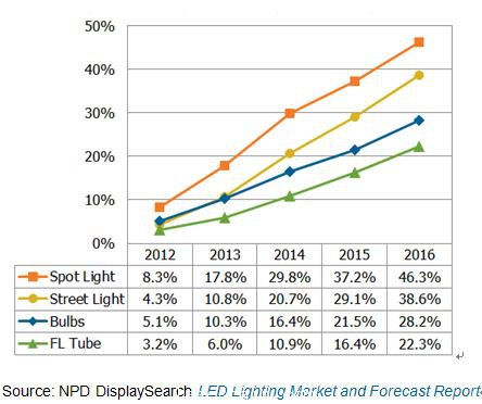 圖一、2012-2016年LED照明產(chǎn)品的市場占有率